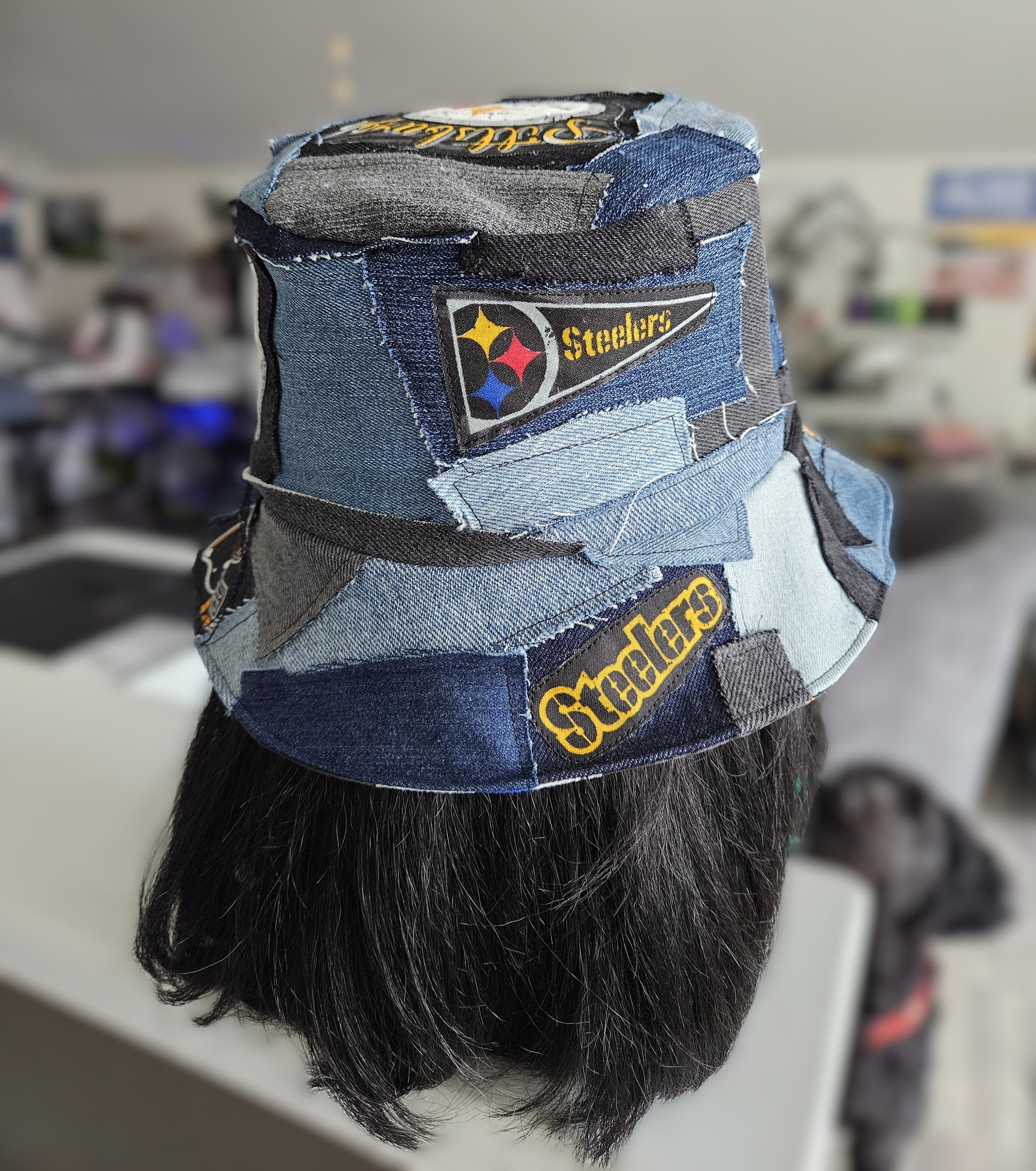 Show your team spirit in style with a handmade, one-of-a-kind bucket hat crafted from upcycled denim and soft cotton. Each hat is made to order and features a satin-lined interior to protect your hair while keeping you cool and comfortable. Inspired by your favorite team’s colors and accents, no two hats are ever the same — each one is a bold, unique way to rep your team on game day or any day.