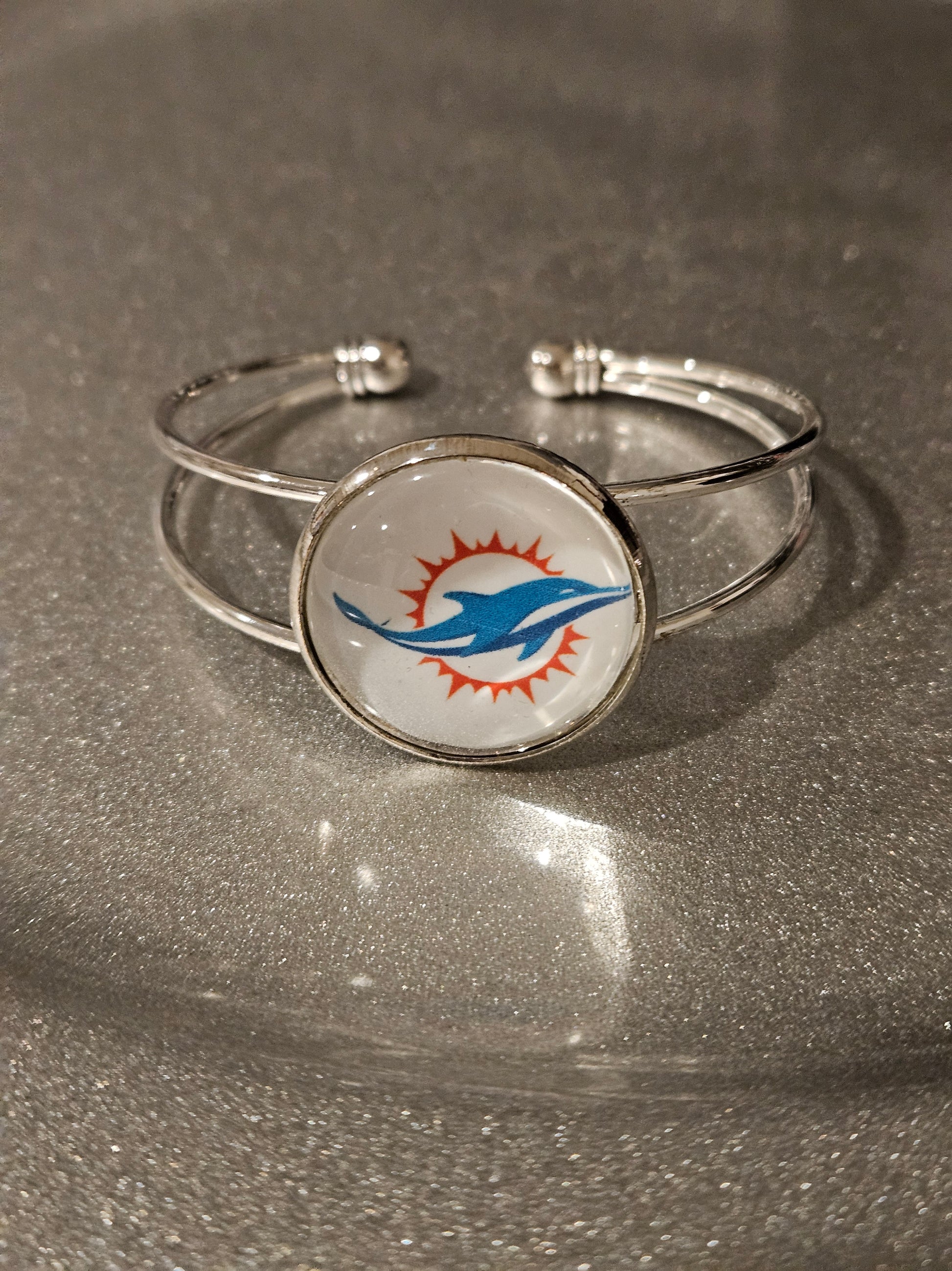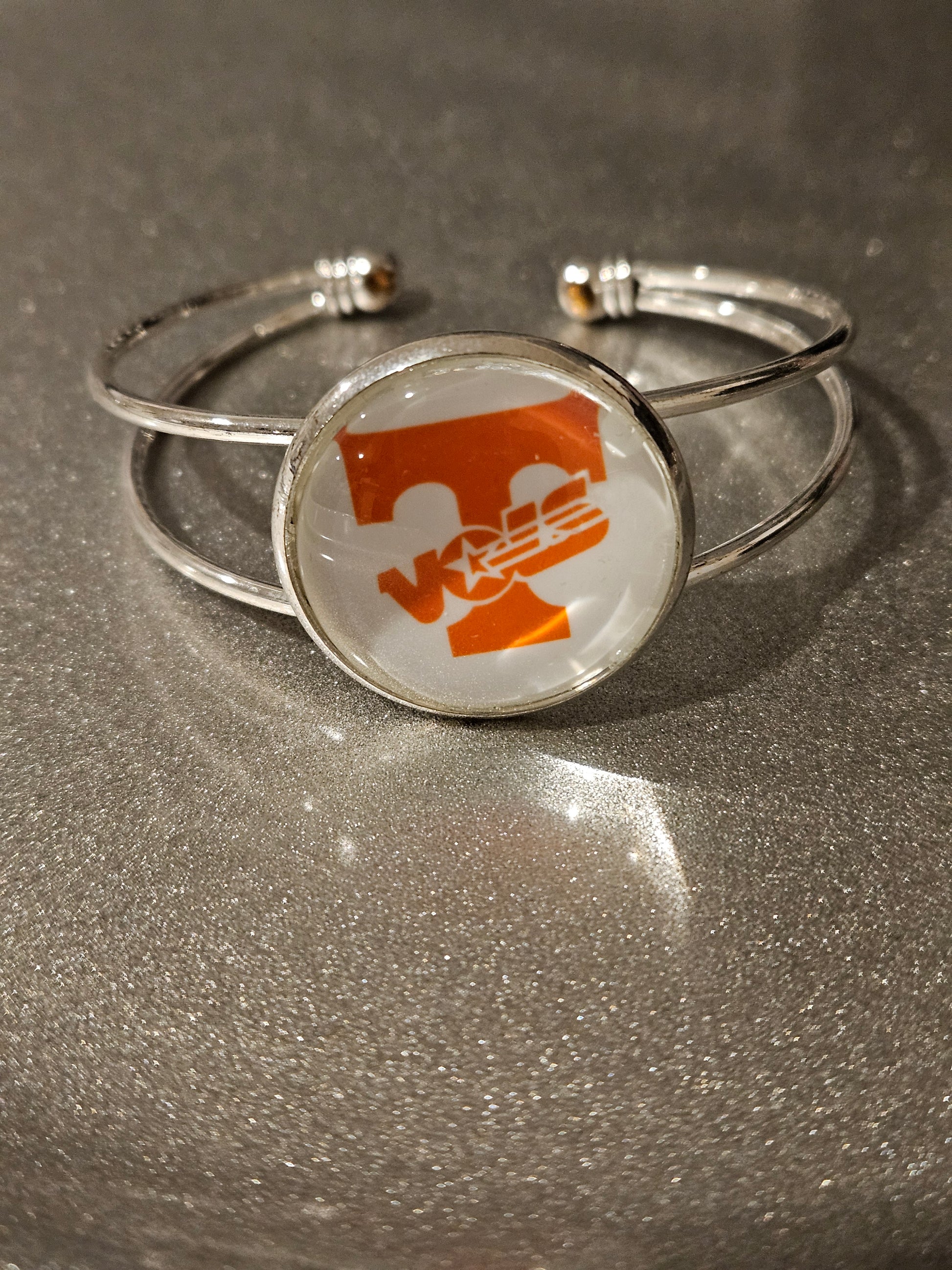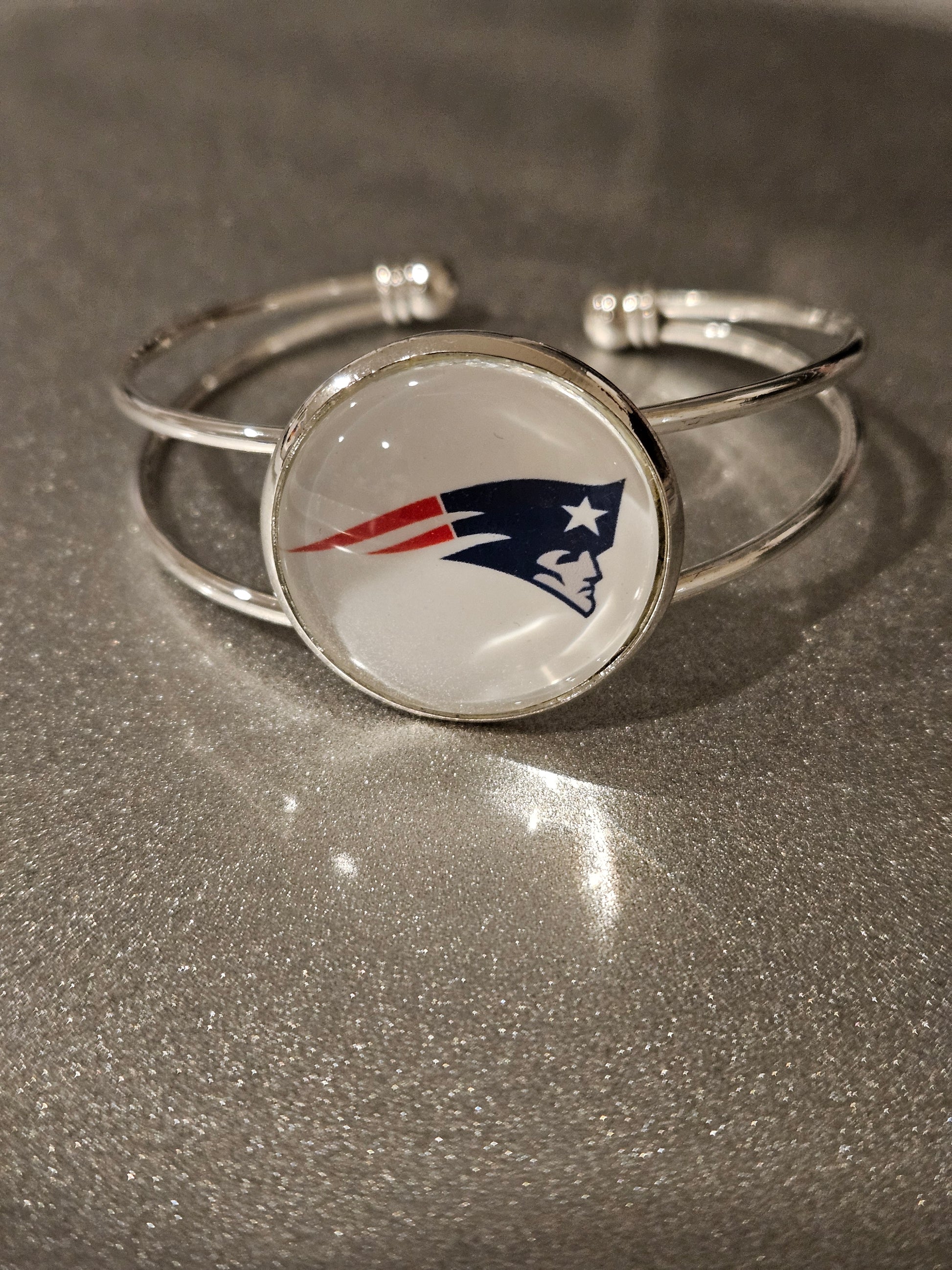 Silver adjustable bangles with round team setting (25mm) measures 55mm to 70 mm with a glass cabochon over the logo. The raw material of this bracelet is made of alloy. The color is silver by electroplating. This is a great bracelet to show your team pride. Customization is also available, just provide the logo.