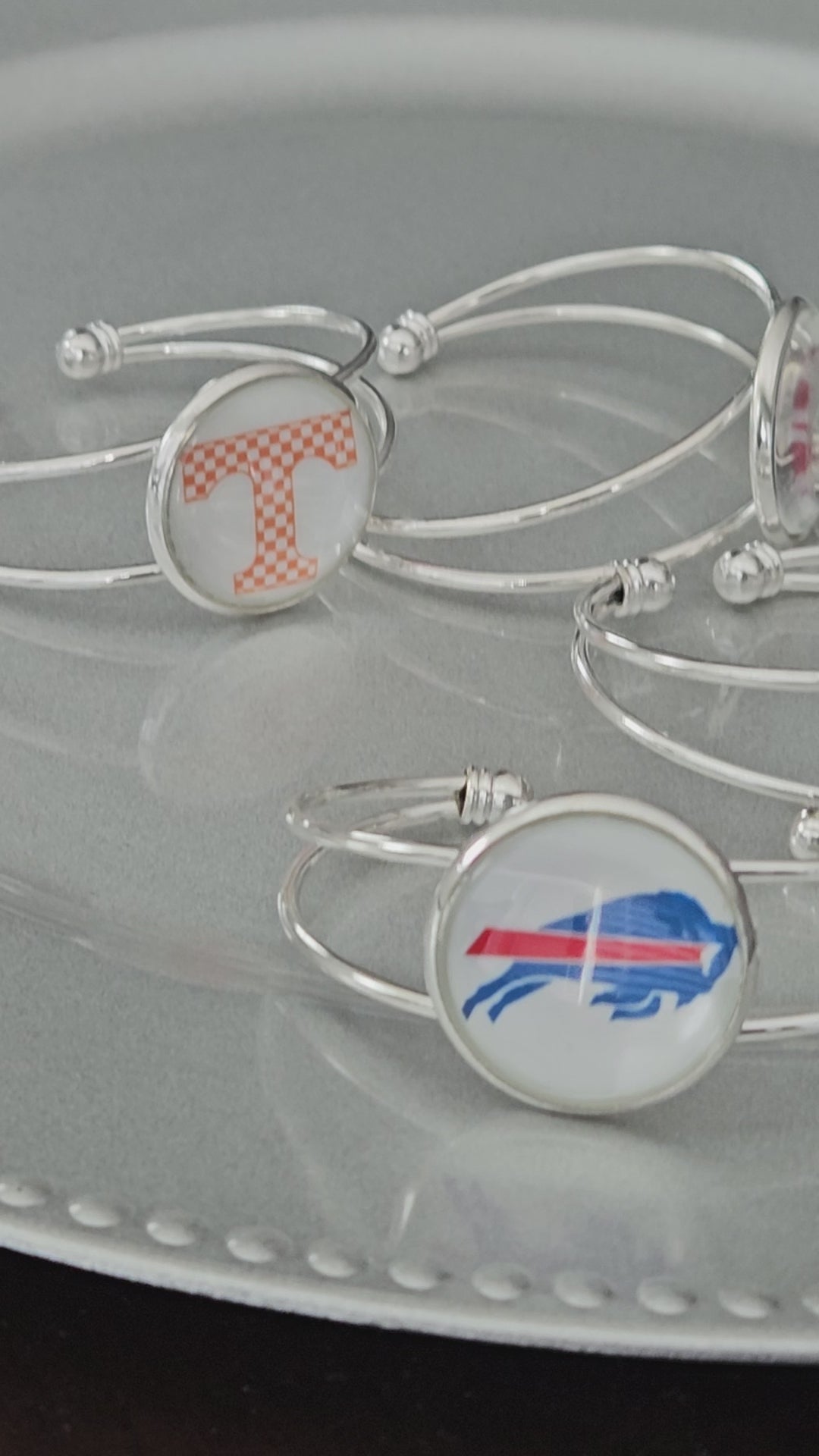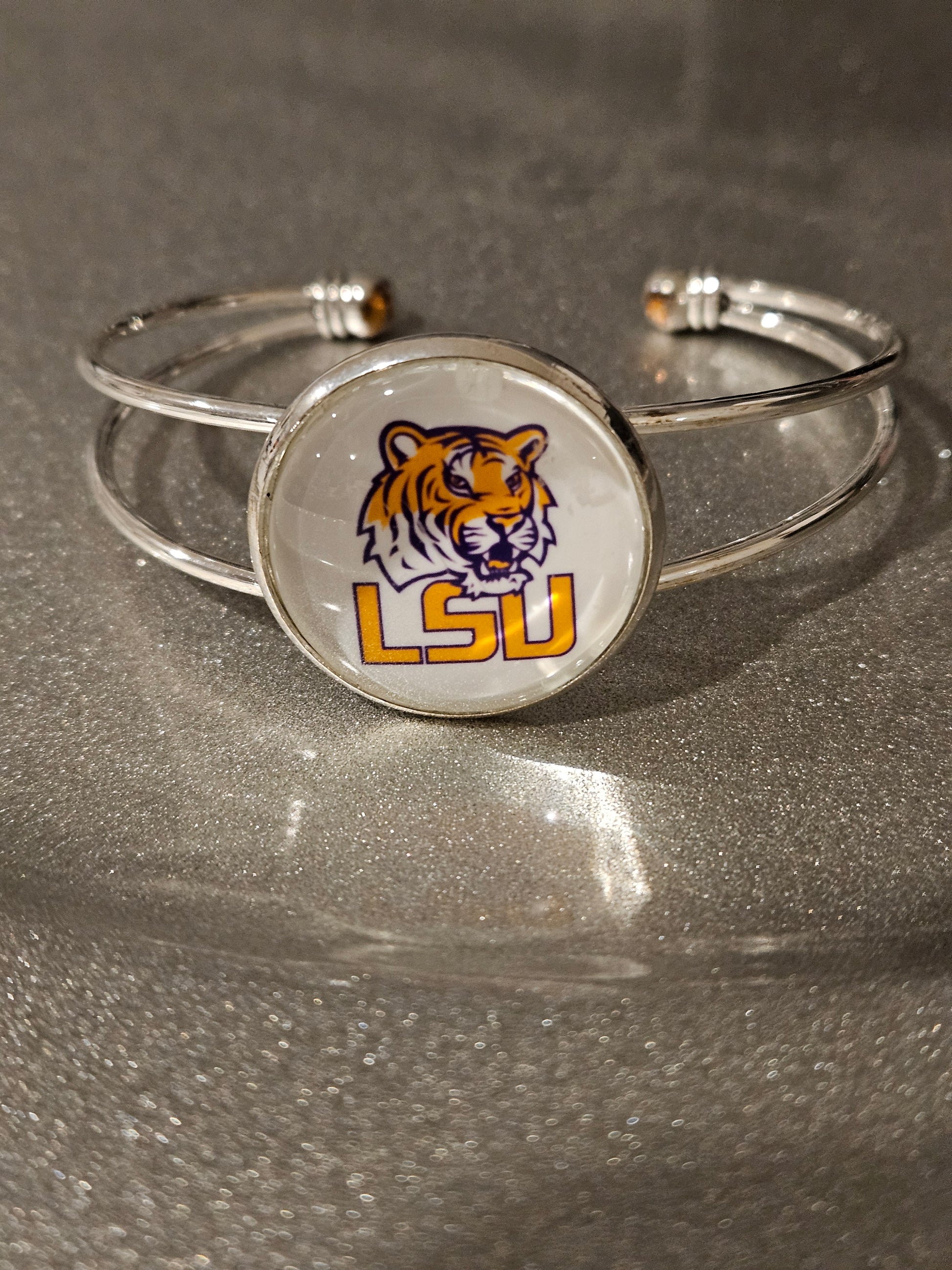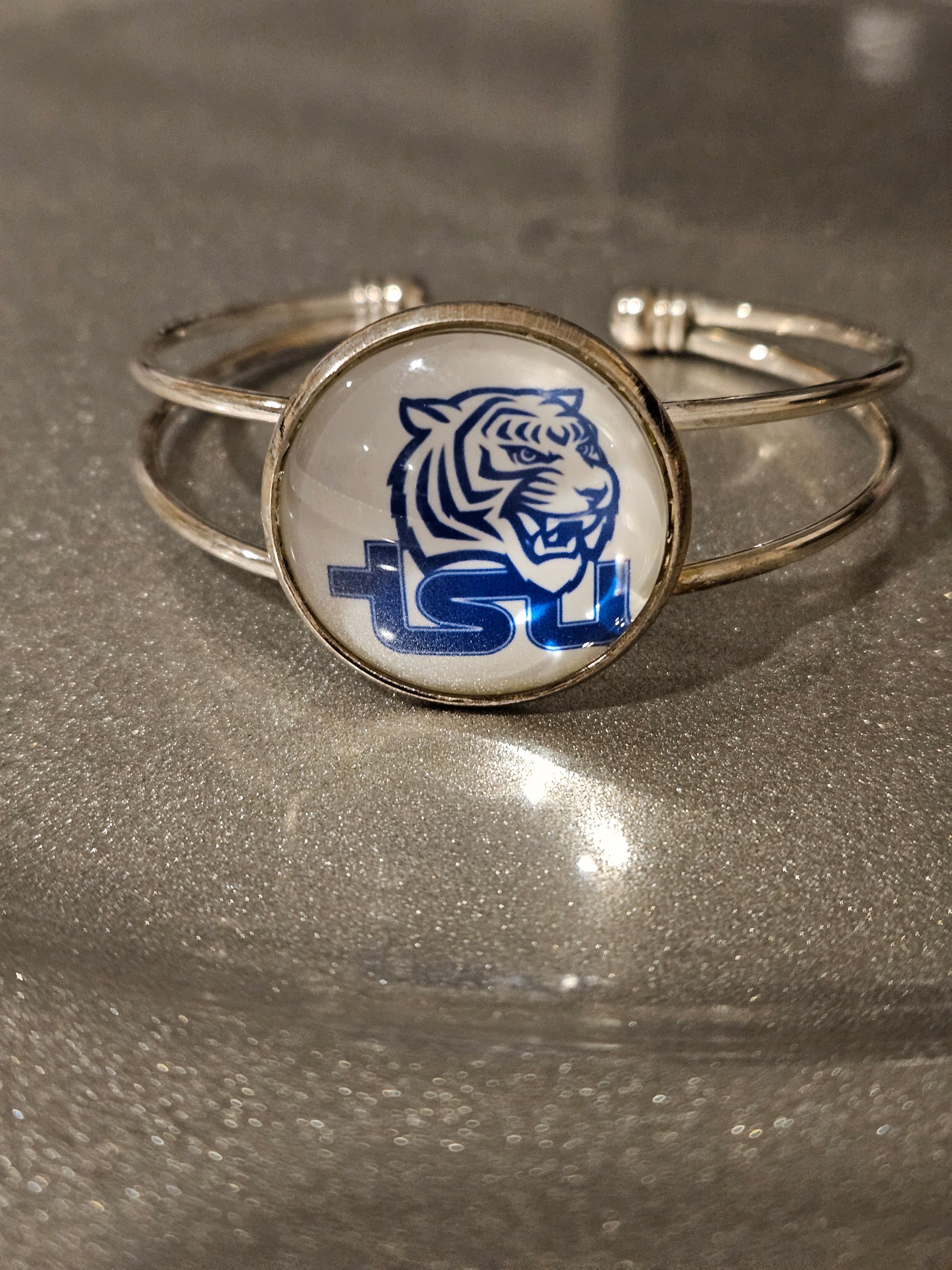 Silver adjustable bangles with round team setting (25mm) measures 55mm to 70 mm with a glass cabochon over the logo. The raw material of this bracelet is made of alloy. The color is silver by electroplating. This is a great bracelet to show your team pride. Customization is also available, just provide the logo.